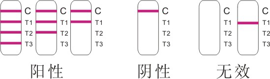 陽性:若有四條紫紅色條帶出現(xiàn)。三條分別位于檢測(cè)區(qū)(T1)、(T2 )和(T3)內(nèi),另一條位于控制區(qū)(C)。結(jié)果表明:樣本中含有以上三種心肌標(biāo)志物。