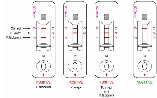 三條測(cè)試線都出現(xiàn),表明惡性瘧原蟲和間日瘧原蟲都為陽(yáng)性。