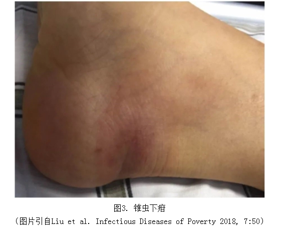 發(fā)熱、頭痛、瘙癢、肌肉疼痛、骨骼疼痛、表情淡漠、共濟失調(diào)、嗜睡和昏睡等癥狀,錐蟲下疳(gān)(如圖3)、淋巴結(jié)腫大、肝脾腫大等體征。其中,岡比亞錐蟲病發(fā)病進程慢,而羅得西亞錐蟲病發(fā)病進程快。}
