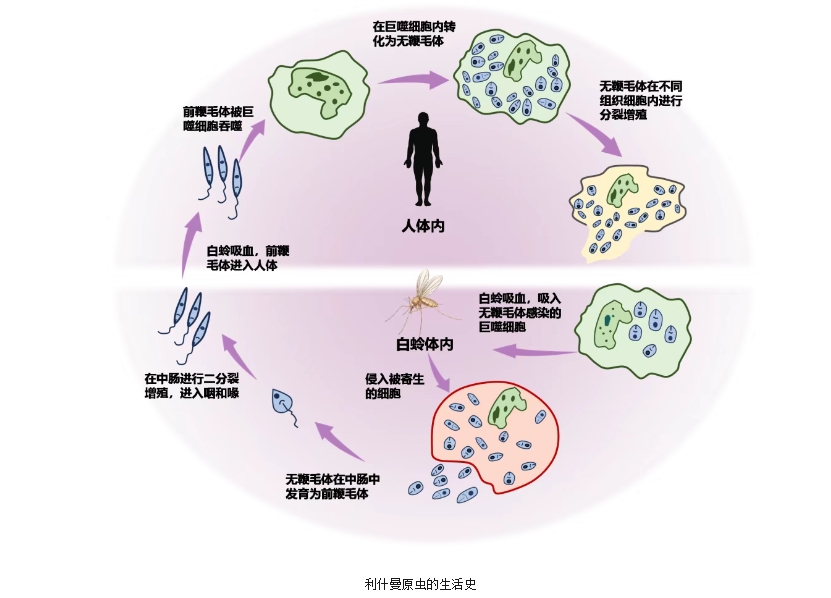 傳播過程?:白蛉通過叮刺病人或受感染的動(dòng)物宿主時(shí),含無鞭毛體的巨噬細(xì)胞被白蛉吸入并在體內(nèi)發(fā)育成具有感染力的前鞭毛體,轉(zhuǎn)而叮刺健康人,前鞭毛體即隨白蛉唾液進(jìn)入人體,從而引起感染?。